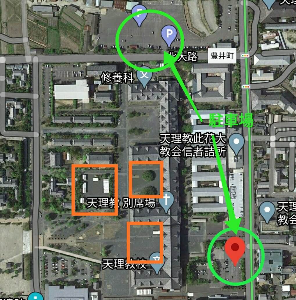 天理教北2駐車場か、東1駐車場が近場の駐車場ですね。